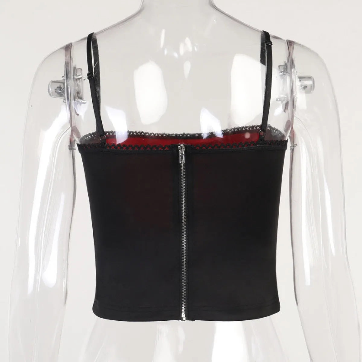 Pair it with a black mini skirt, chunky boots, and a bat choker for a full gothic club look, or layer under a mesh top for a dreamy pastel goth aesthetic. This cami turns heads whether it’s styled for a night out or a dark academic day vibe.