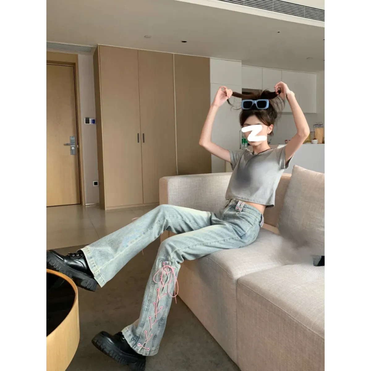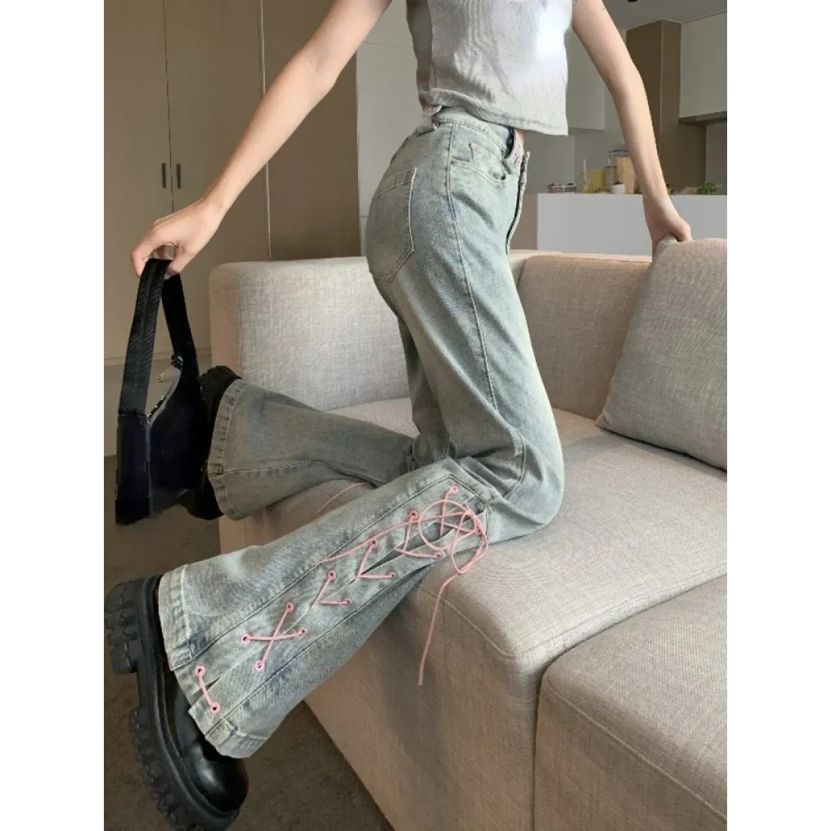 If you love standing out with bold fashion choices, these lace-up flare jeans are your new go-to. With their vintage wash and playful side lacing, they strike the perfect balance between tough and cute. Whether you’re headed to a casual hangout or an aesthetic photo shoot, they’ll give you main character energy every time. Don’t miss your chance to rock this dreamy denim—grab yours now and let your legs do the talking at Kawaii Stop!