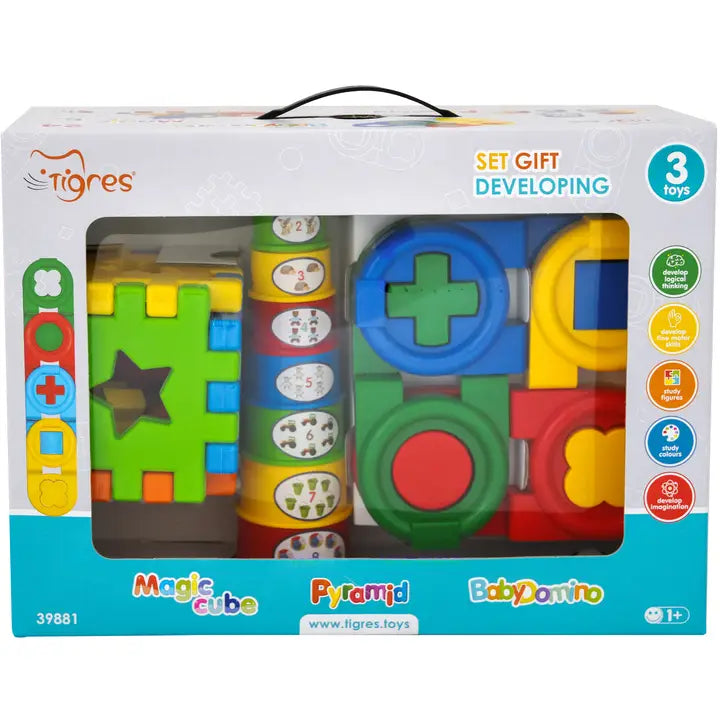 The set includes three different educational toys: a sorting cube, a pyramid, and a domino puzzle.