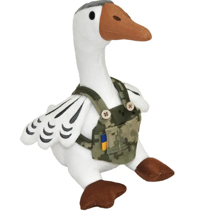 Goose "Defender", Tigres is a designer toy in a plate holder. The goose is dressed in an improvised plate carrier decorated with the flag of Ukraine. The wings of the "Defender" are decorated with embroidery. Thanks to the unusual armor, this toy is different from others, it will be a great gift or souvenir.