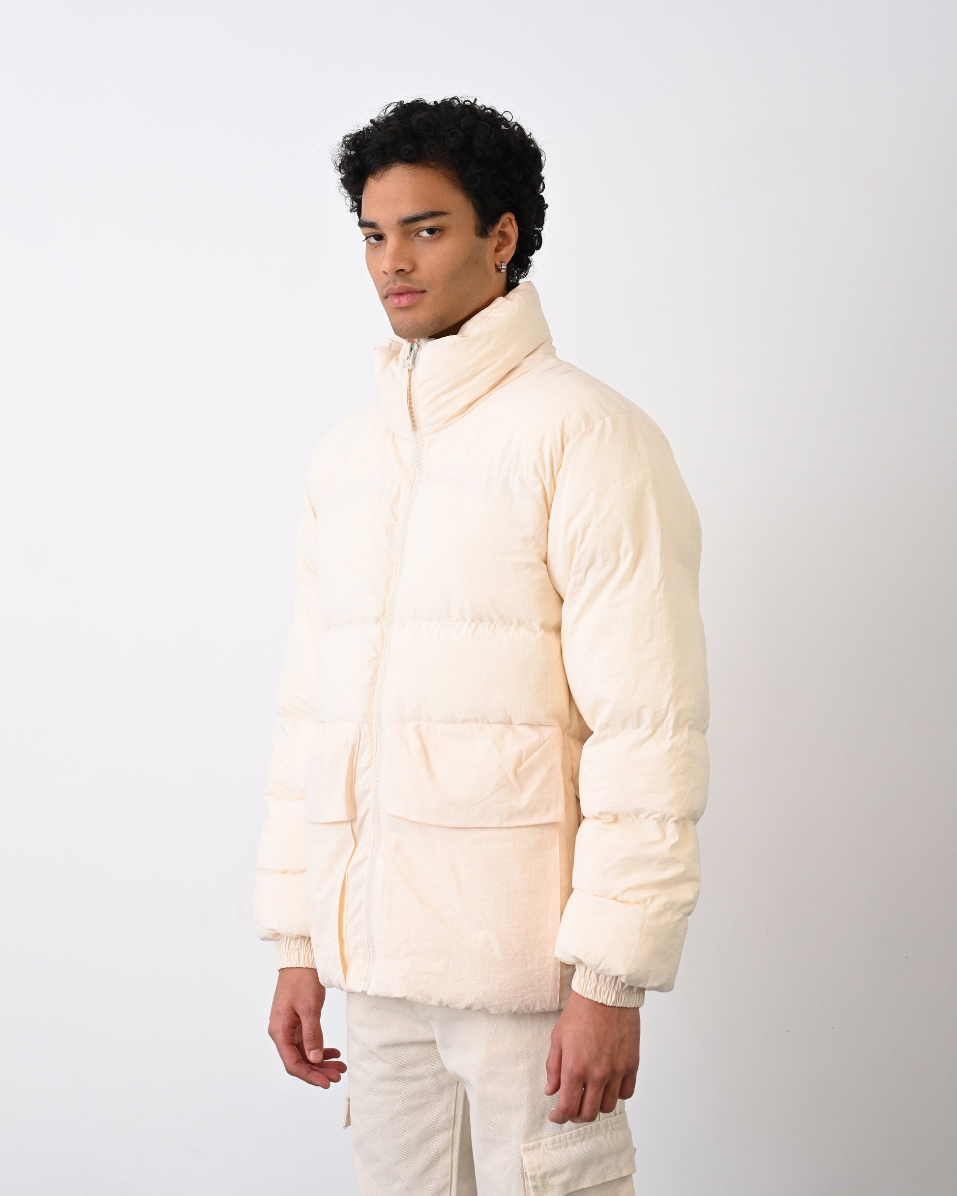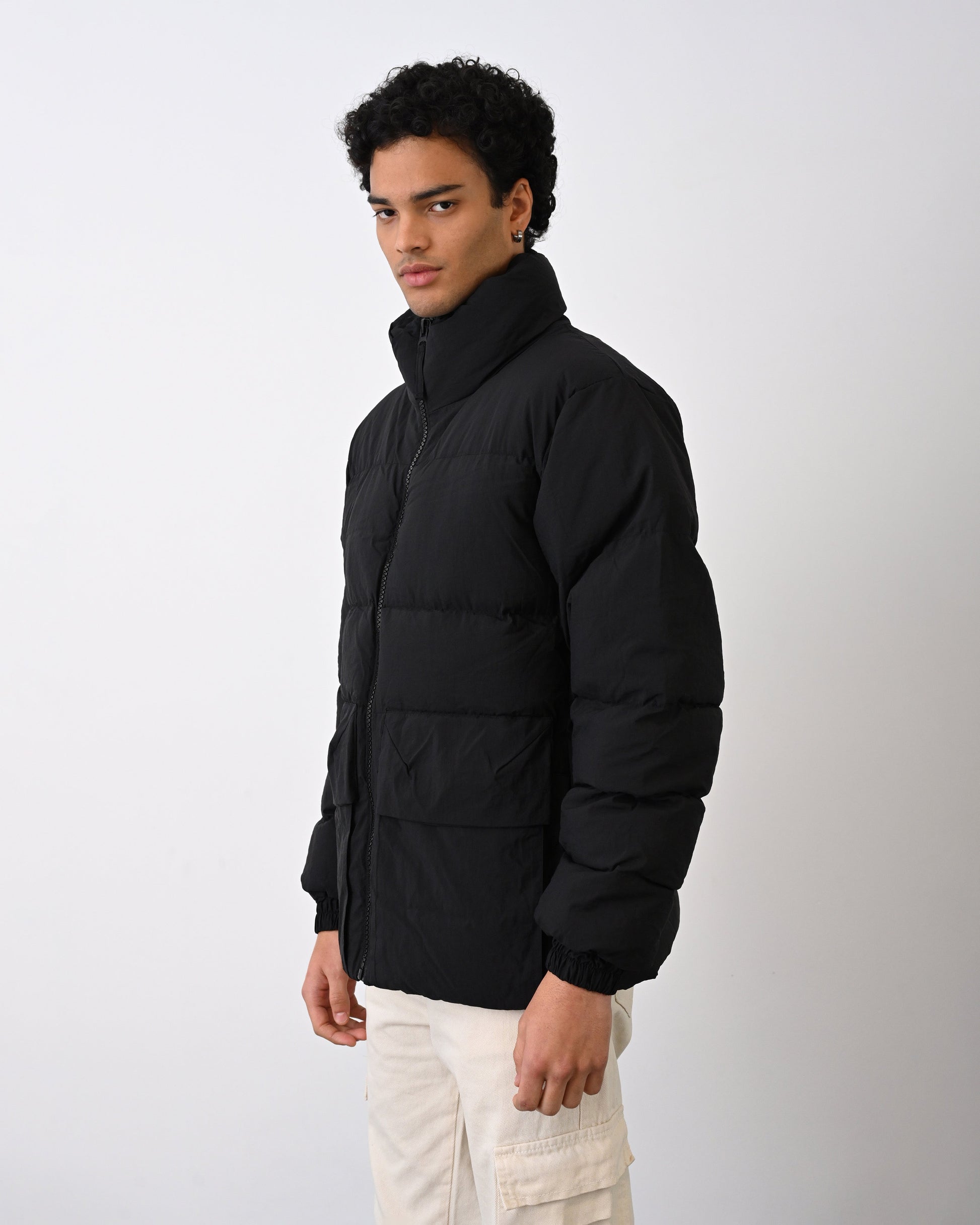 Men's Premium Puffer Jacket with High Collar and Utility Pockets.