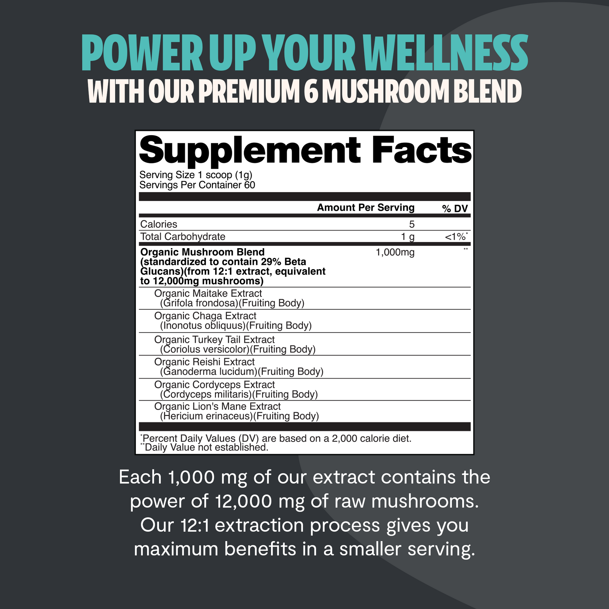 Premium mushroom blend featuring six powerful extracts for complete wellness. Our mushroom complex delivers 12,000mg raw mushroom power in versatile powder form.